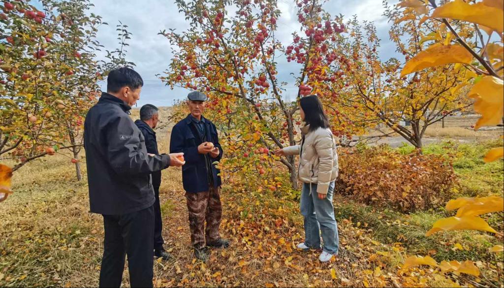 在恰庫爾圖鎮,技術專家親自示范,帶領工作人員對鎮區的果樹和綠化樹種進行清理、修剪和開展施肥。在哈希翁村巴哈提庭院,一畝多地的蘋果園還掛著許多蘋果。除去賣掉的700公斤外,果園還有一噸半蘋果,預計收益可達2萬余元。技術專家一邊商量幫助巴哈提銷售蘋果,一邊指導他把蘋果摘下來入窖儲存,并針對蘋果在果梗和花萼出現裂口現象給予解答。