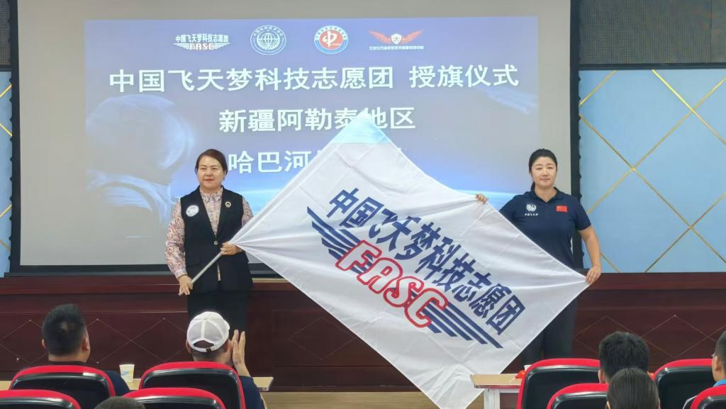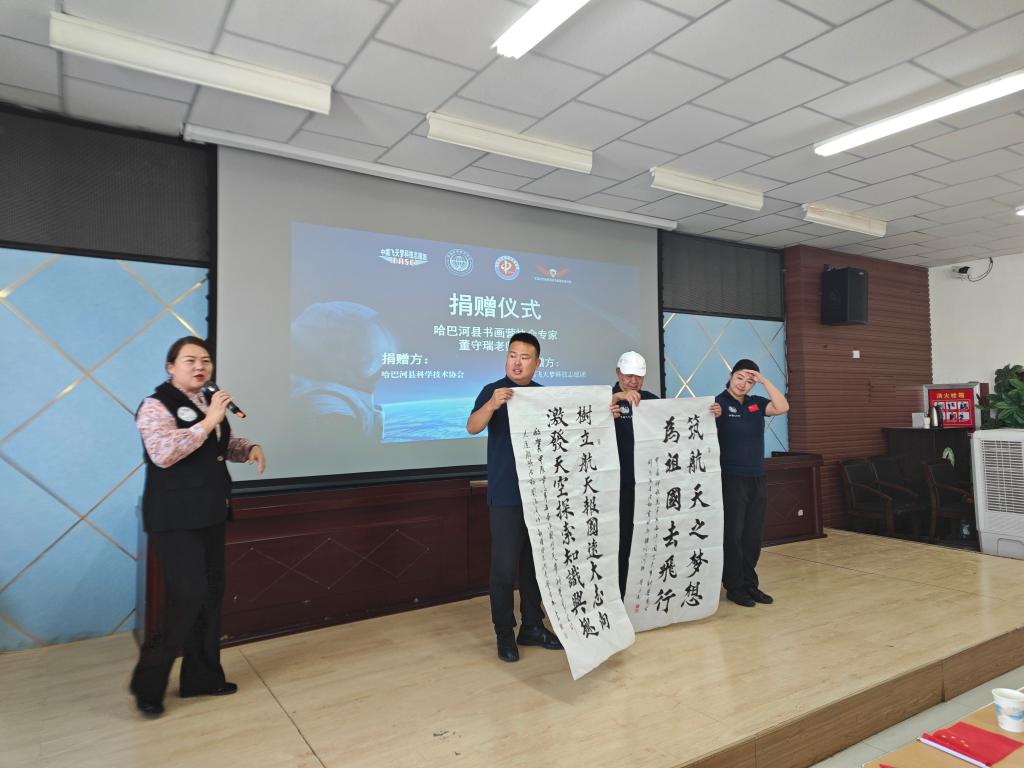 活動中,哈巴河縣科協向中國飛天夢科技志愿團贈送哈巴河縣書畫營協會專家董守瑞老師的親筆書法作品。中國飛天夢科技志愿團副團長張海同志向阿勒泰地區哈巴河縣大隊進行授旗。