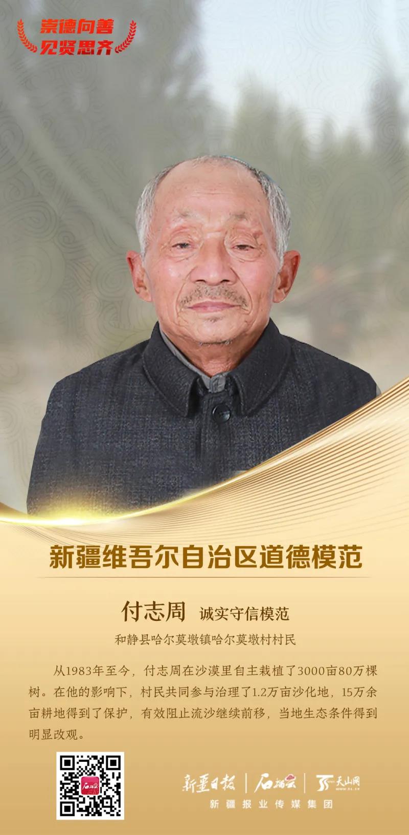 付志周是和靜縣哈爾莫墩鎮(zhèn)哈爾莫墩村村民,從1983年至今,他已在沙漠里種了3000畝80萬棵樹,曾經(jīng)的荒漠變良田,辣椒、玉米等農(nóng)作物連年豐收。