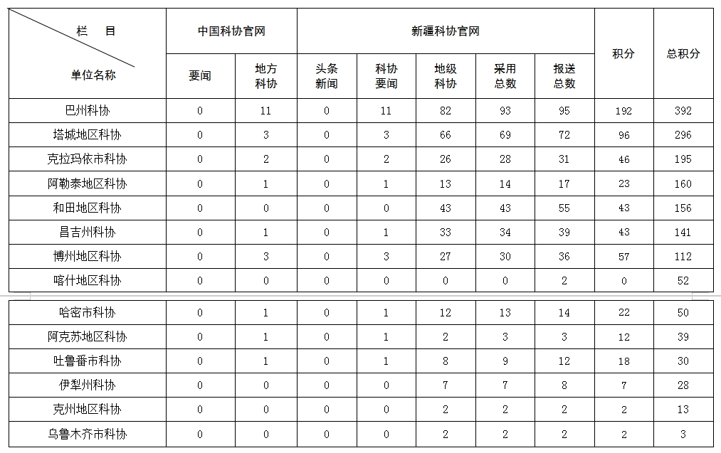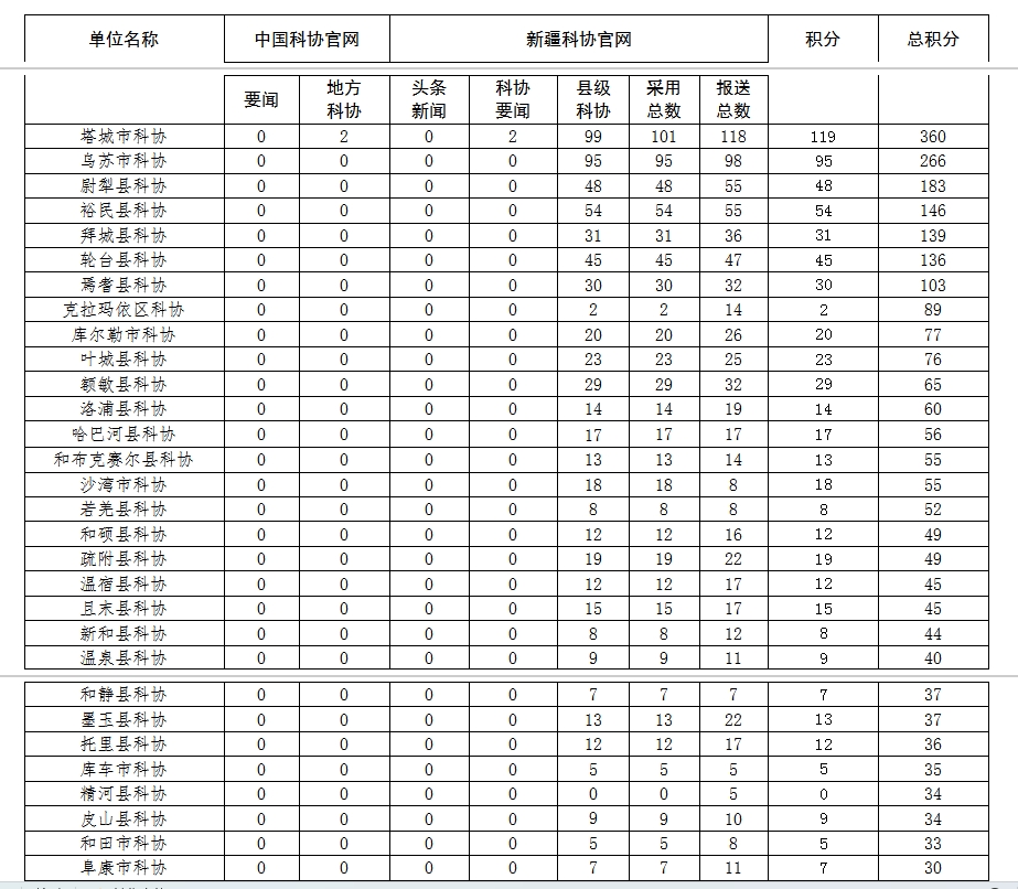 注:1.被自治區科協官網“頭條新聞”采用的信息,每條10分;“科協要聞”欄目采用的信息,每條5分;其它欄目采用的信息,每條1分。
