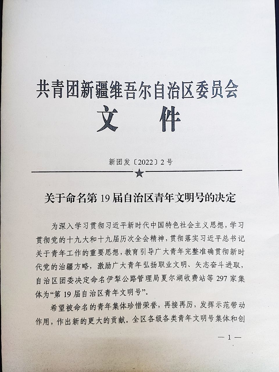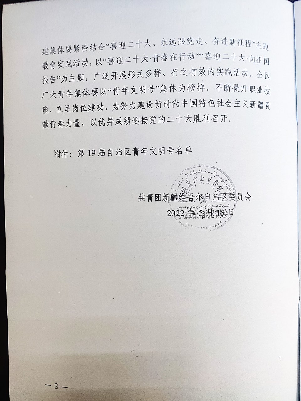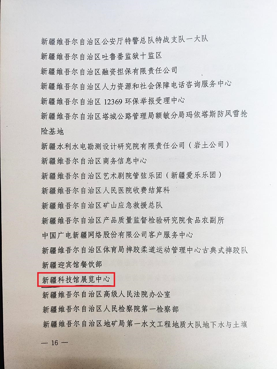 根據(jù)共青團(tuán)新疆維吾爾自治區(qū)委員會(huì)《關(guān)于命名第19屆自治區(qū)青年文明號(hào)的決定》(新團(tuán)發(fā)【2022】 2號(hào)),新疆科技館展覽中心榮獲“第19屆自治區(qū)青年文明號(hào)”榮譽(yù)稱號(hào)。