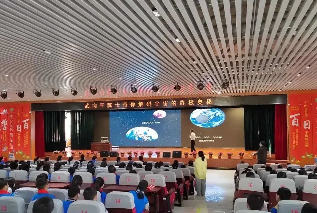 武向平院士憑借其深厚的學(xué)術(shù)造詣與豐富的科普經(jīng)驗,用生動形象、通俗易懂的語言,深入淺出地講解了 “宇宙是什么、從哪里來、到哪里去,誰在決定宇宙的命運(yùn)” 等一系列引人深思的問題。在講解過程中,武院士運(yùn)用大量生動有趣的例子與高清震撼的圖片、視頻,向師生們演示了宇宙結(jié)構(gòu)的形成和演化過程。從廣袤無垠的星系,到神秘莫測的黑洞、中子星等天體;從宇宙誕生之初的大爆炸理論,到未來宇宙的可能走向,每一個知識點都被武院士講述得妙趣橫生,牢牢吸引著臺下師生們的目光。大家全神貫注,沉浸在這場宇宙知識的盛宴中,親身感受著宇宙的浩瀚與神奇。