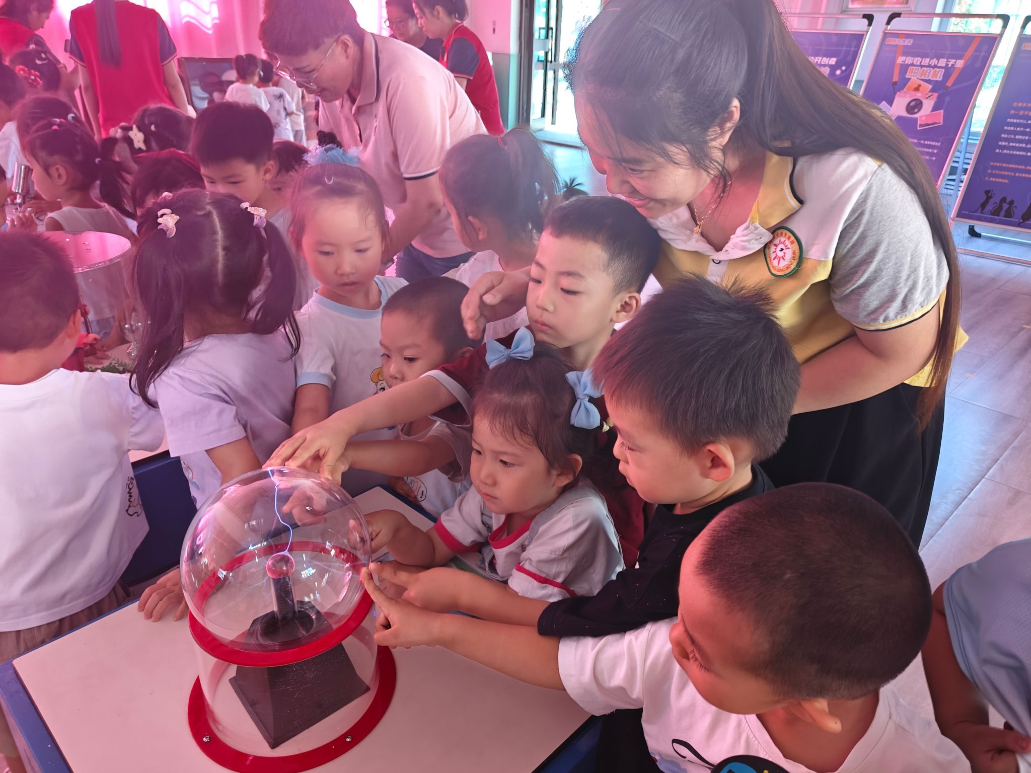 7月8日,科普大篷車開進御宮華府幼兒園,小朋友們在老師的帶領下體驗“輝光球”設備