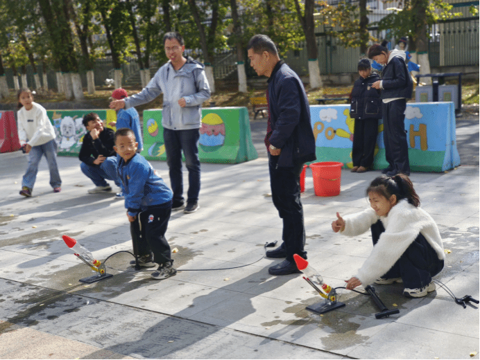 “乘風(fēng)破浪的火箭”發(fā)射區(qū)則上演著“水火箭”競速賽。孩子們在父母的協(xié)助下通過調(diào)節(jié)氣壓與發(fā)射角度,將自制水火箭送至15米外的目標區(qū)。來自市第126中的李翔霖激動地說:“我調(diào)整了三次發(fā)射架的角度才成功,真是太有意思了!”