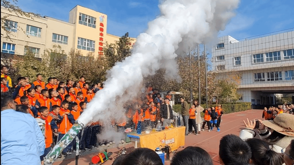隨后,一朵大型蘑菇云在實驗臺前騰空而起,校園操場瞬間沸騰。接著學生在專業科普人員的指導下操作著特制裝置,將干冰與水霧巧妙結合,制造出極具視覺沖擊力的“科學奇觀”,同學們紛紛驚呼,近距離感受物理現象的奇妙魅力。隨著全場師生齊聲倒數“3、2、1”,一枚煙霧大炮轟然發射,白色煙霧在校園上空劃出靈動弧線,這場充滿科技魅力的快閃活動在歡呼聲中落幕。