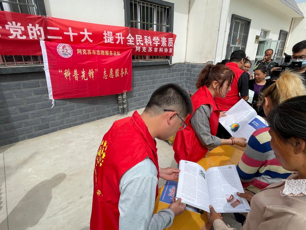 活動中,阿克蘇市科協組織科普志愿者現場為農民群眾發放科技農業生產操作手冊、科普宣傳圖書畫冊等科普宣傳資料。