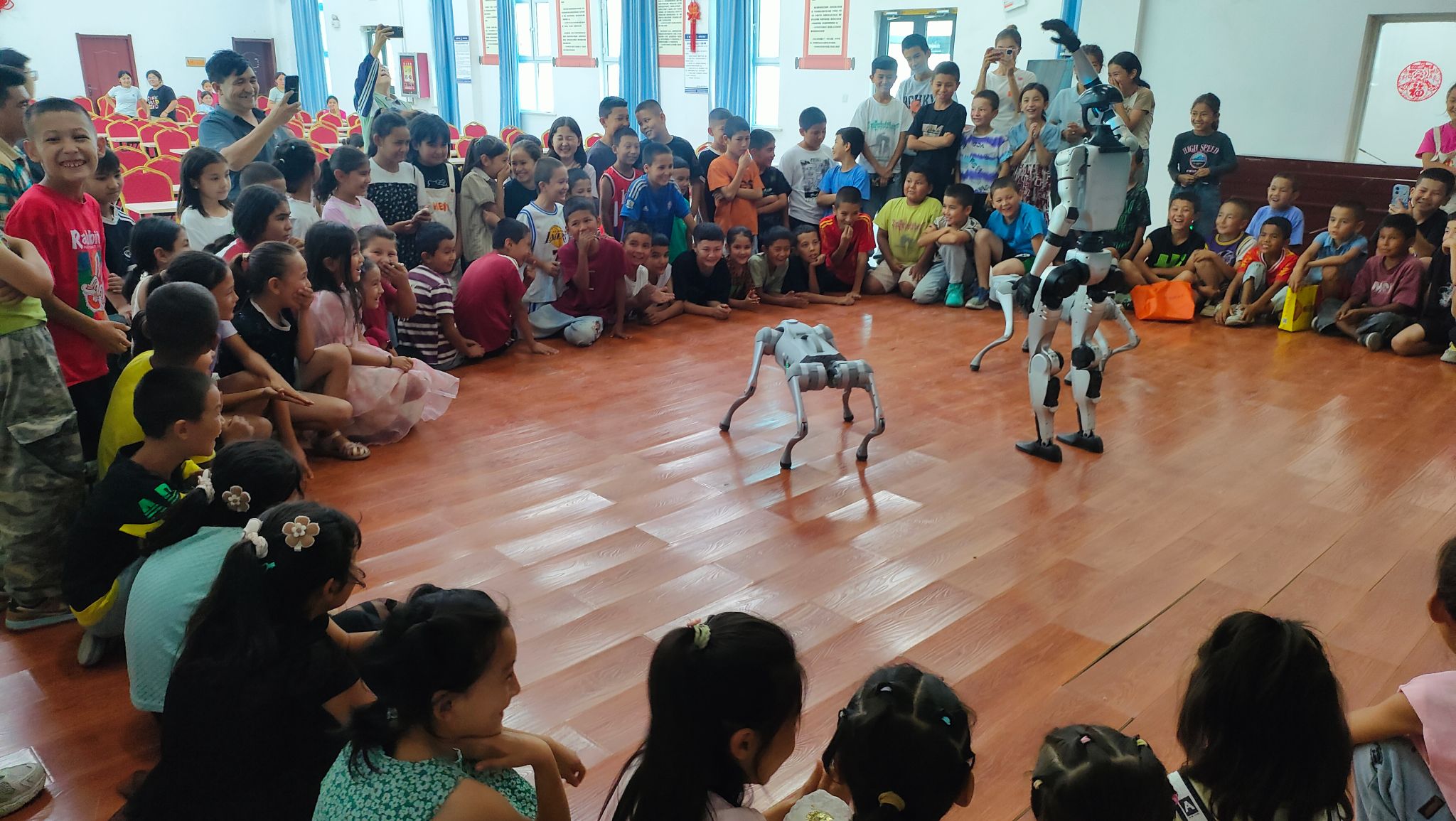 在且末縣托格拉克鄉(xiāng)蘭干村葡萄棚的綠蔭下,歡樂(lè)的笑聲此起彼伏。兩只機(jī)器狗隨著音樂(lè)節(jié)拍,整齊地做出招手、飛吻甚至利落地前空翻,孩子們“哇”聲一片,眼中滿(mǎn)是驚喜。隨后的倒立行走表演,更讓孩子們目不轉(zhuǎn)睛,眸中仿佛有星光閃爍。