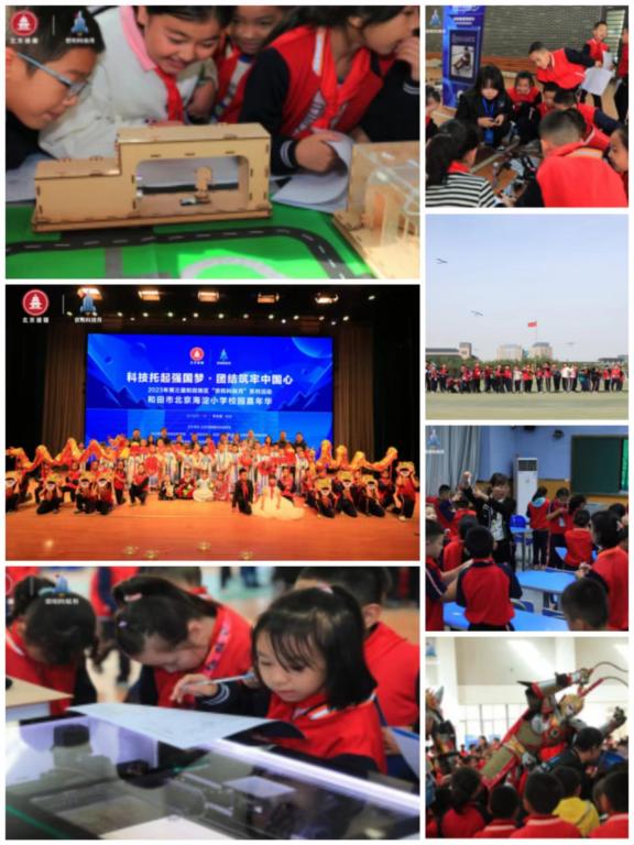 精彩的無人機編隊表演正式拉開科技節(jié)的帷幕。本屆科技節(jié)活動精彩紛呈、形式多樣,內(nèi)容豐富有趣、科技感強,分為上午科技節(jié)開幕式表演及科技互動體驗項目和下午進班級科普活動及科普講座兩部分進行。開幕式還展示了科技老師們帶來的科學秀表演《穿越之奇幻科技節(jié)》、海淀學生的經(jīng)典誦讀《中國傳統(tǒng)節(jié)日》。科技互動體驗項目包含海淀小學科技社團的學生科技創(chuàng)作區(qū)及科技節(jié)機器人互動體驗區(qū):足球機器人對抗、無人駕駛機器人、動感小車表演;科技創(chuàng)新體驗區(qū):激光雕刻機、金屬機器人DIY、車輛駕駛體驗、無土栽培柜等展示;航空航天科技展區(qū)車模遙控表演;人工智能展區(qū):智能機械臂;元宇宙展區(qū):VR虛擬場景愛國主義教育、VR體感射擊體驗天宮空間站、航天AI感知交互體驗。異彩繽紛的科技體驗項目,科技感滿滿的科技儀器,創(chuàng)新有趣的科技作品,極具美感的美猴王、黑熊的科技舞蹈。給孩子們帶來了一場饕餮盛宴,讓好奇與童真、智慧與科技碰撞出絢麗的火花。